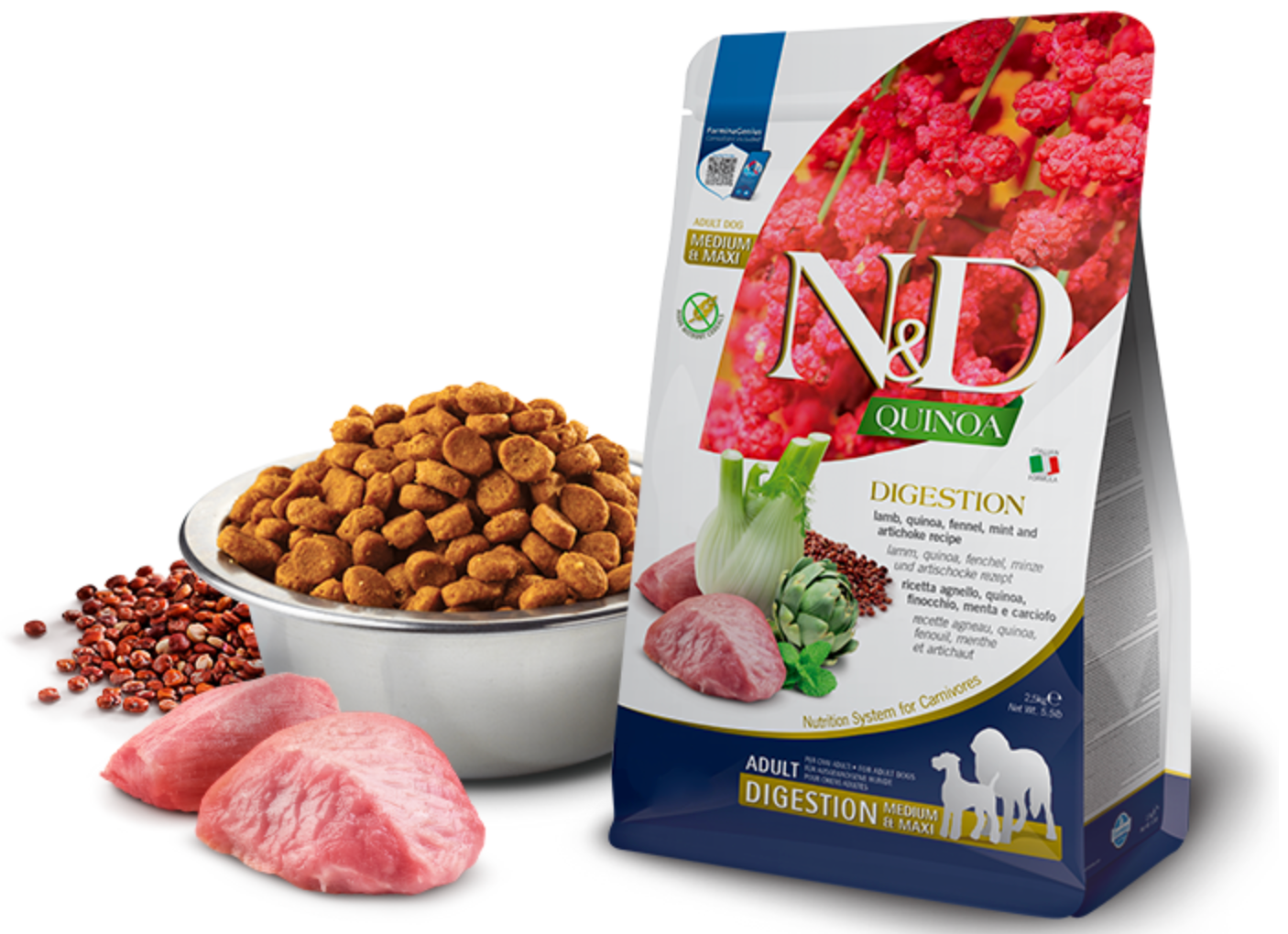 N&D Quinoa DIGESTION - Lamb, quinoa, fennel, mint and artichoke recipe for adult dogs is formulated to meet the nutritional levels established by the AAFCO Dog Food Nutrient Profiles for maintenance.
