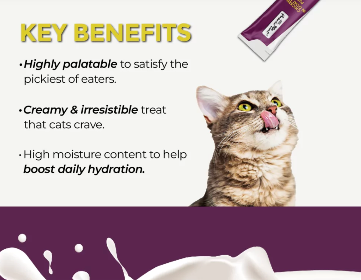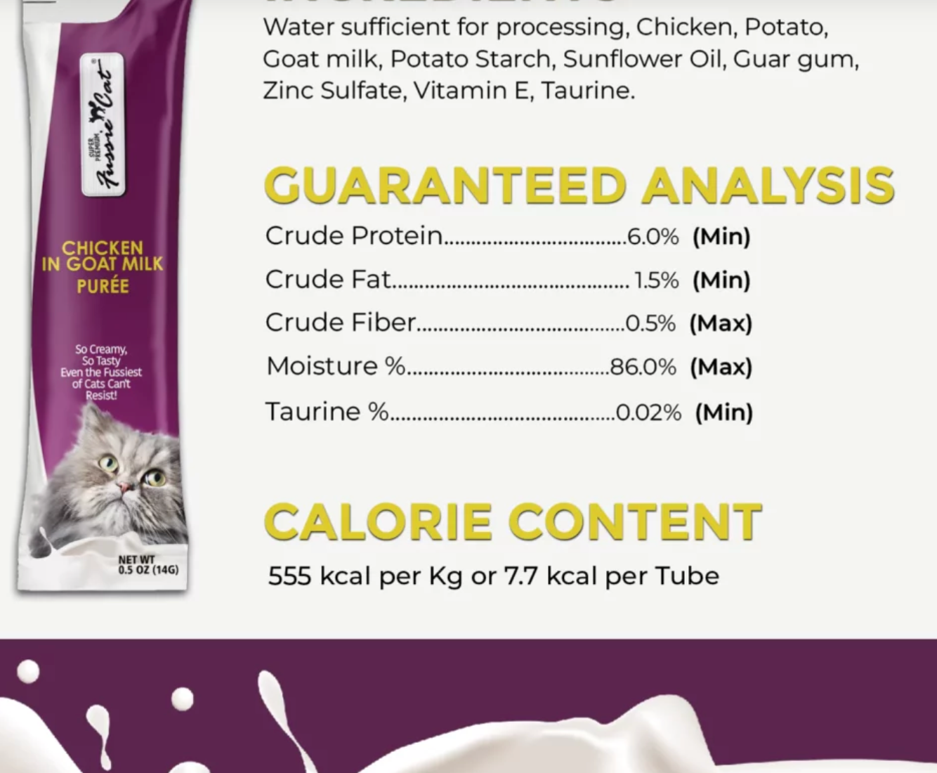 Our signature Chicken in Goat Milk Purée is a celebration of pure poultry-loving goodness, enhanced by the gentle nourishment of goat milk. Puréed to palatable perfection, this treat is a classic favorite reimagined, promising a wholesome and hearty meal that’s perfect for even the fussiest of felines. Each serving is crafted to provide essential nutrients and promote overall health, with goat milk offering added benefits such as improved digestion, hydration, and inflammation relief. This purée is designed to satisfy your cat’s cravings while supporting their well-being, making it an ideal choice for treat time or as a meal topper. Ready to delight your feline friend with a luxurious and nutritious treat?fu