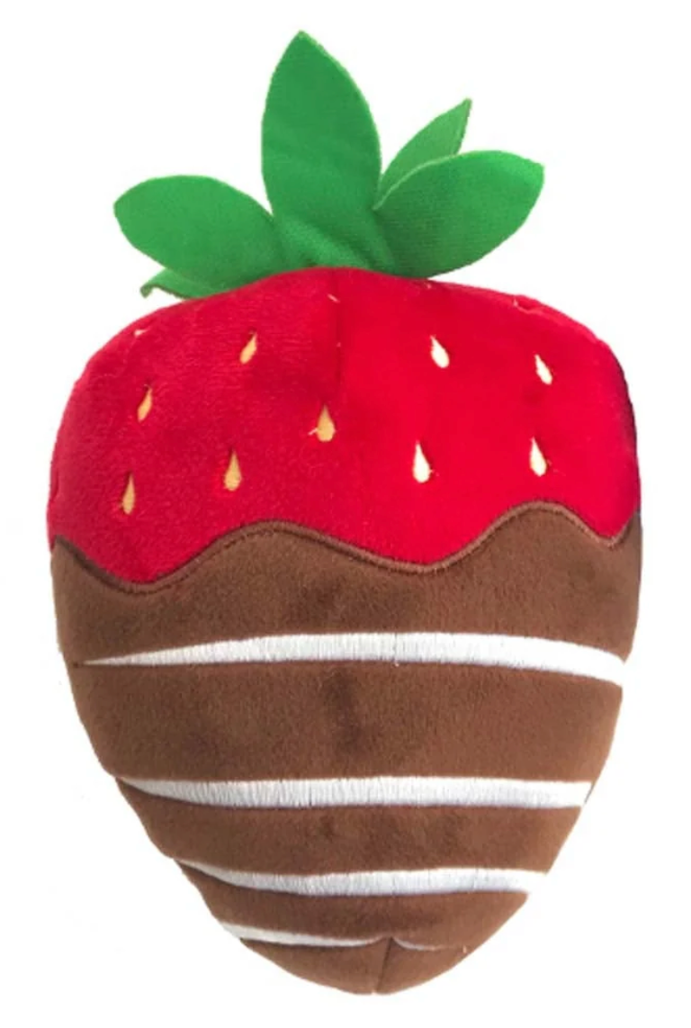 Dip into decadence! This deliciously designed plush toy is a treat for the senses with its velvety chocolate base, fluffy cream stripes, and a ripe red top complete with a green plush leaf. Perfect for a game of fetch or as a pillow for sweet dreams, this toy brings a slice of dessert-time bliss to your pup's toy collection. So, go on, let your four-legged friend savor the flavor of playtime indulgence!