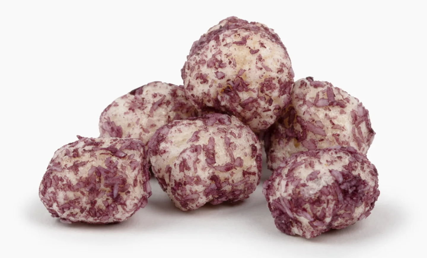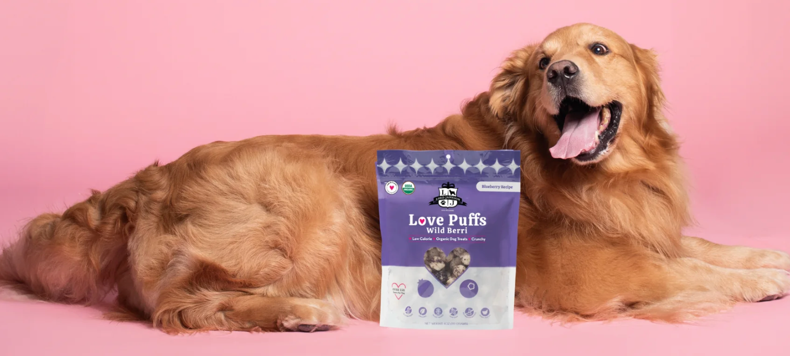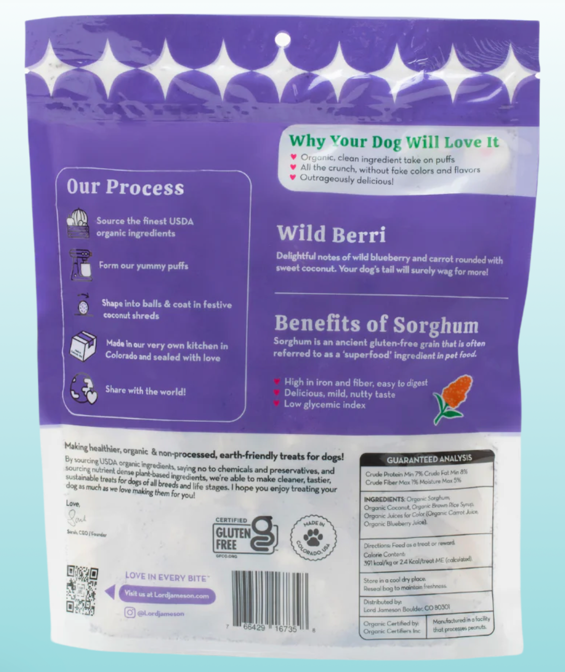 Delightful notes of wild blueberry rounded with sweet coconut. Your dog's tail will surely wag for more! Love Puffs' sorghum base delivers a light, crunchy bite that's gentle enough for even the most sensitive teeth. Each bag contains over 150 low-calorie treats—perfect for daily rewards, snack time, or a tasty training treat!