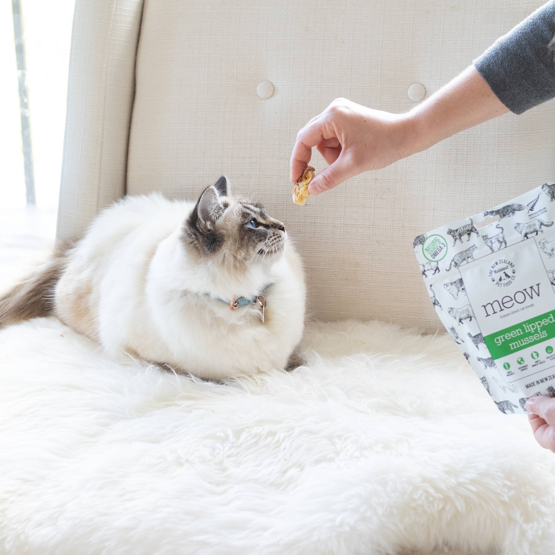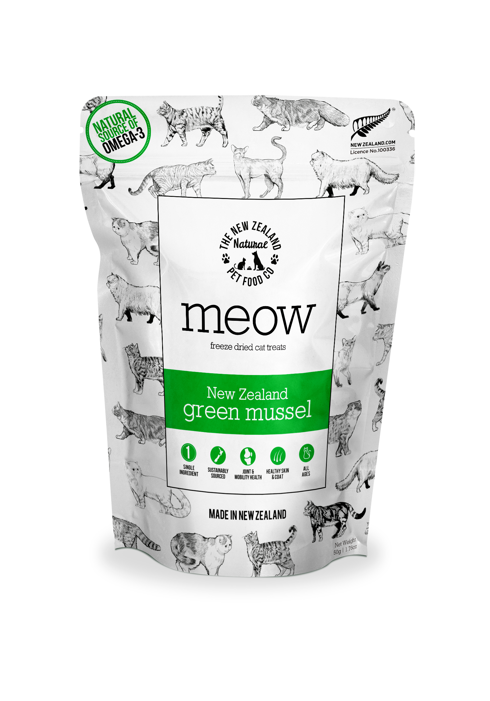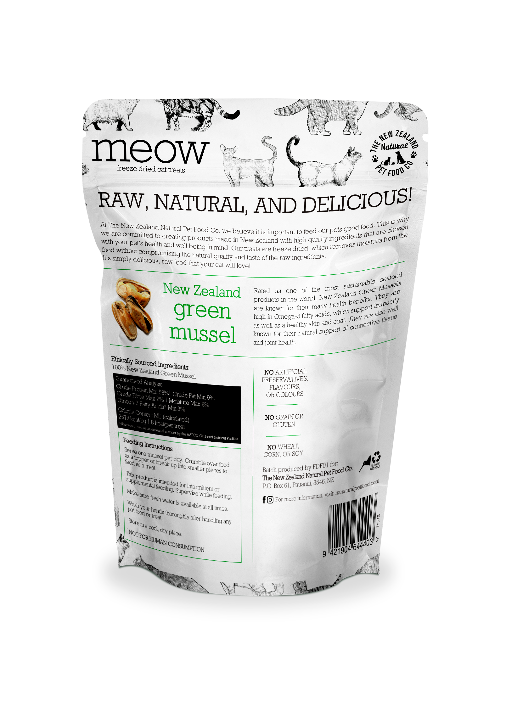 MEOW Green Mussel Treats are a healthy, protein-rich snack for your cat. New Zealand Green Mussels are renowned for their health benefits; they are high in omega-3 fatty acids, and a great source of glucosamine which supports joint health. These MEOW treats have been gently freeze-dried to protect all the natural enzymes and nutrients, so none of the wholesome goodness is cooked out. Raw, Natural, and Delicious!