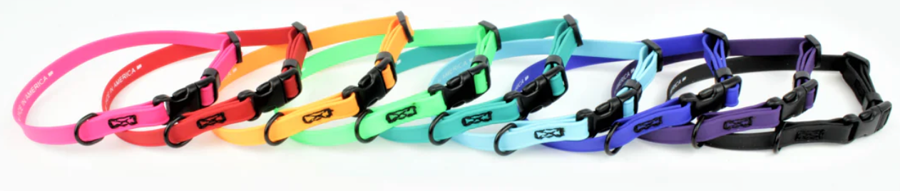 Our Thin BioThane Adjustable Snap Collars are made from scent-proof, durable, and waterproof material. Lots of fun colors available! The material and product is made in the USA.