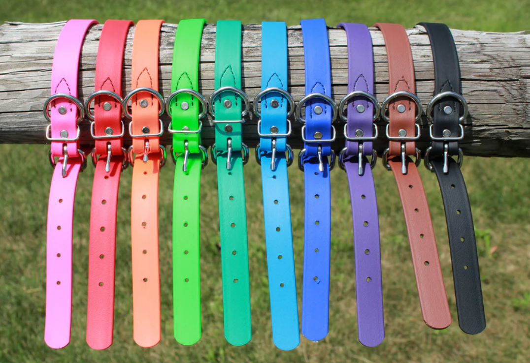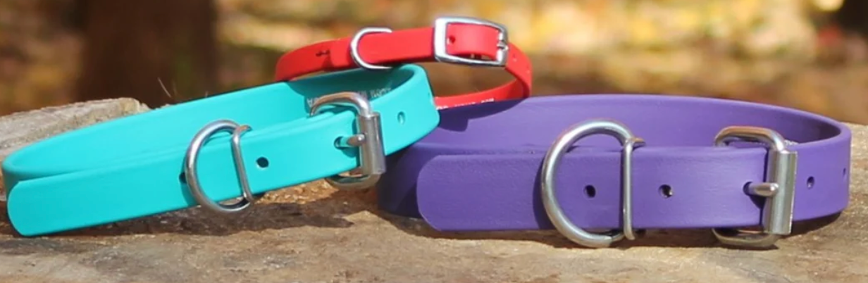 Our BioThane Buckle Collars are waterproof, odor proof, durable and will protect your dog's coat. These collars are handmade in our shop with material made in the USA. BioThane buckle collars are easy to clean and dry quickly.
