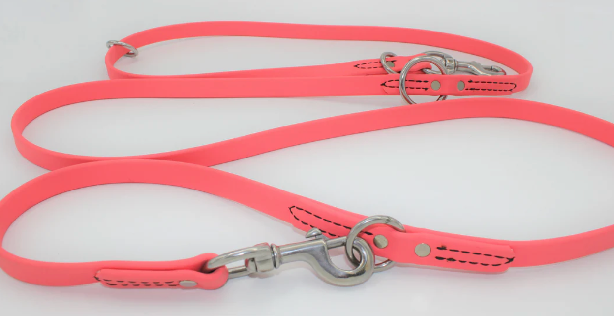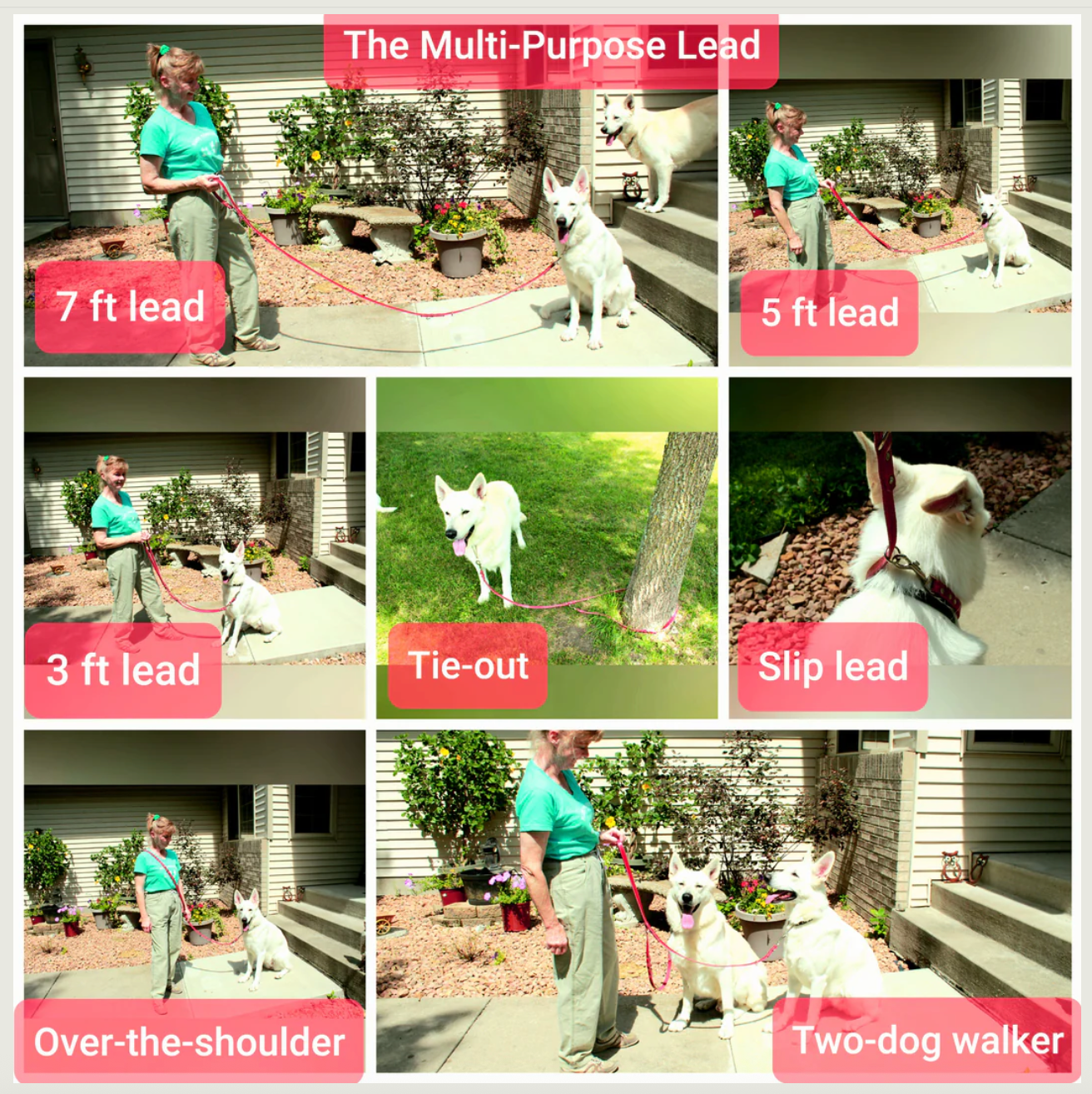 These leashes can be used as hands free, slip leash, tie out, two dog walker, 7' leash, 5' leash, and a 3' leash. We use commercial grade stitching with rivets for longevity