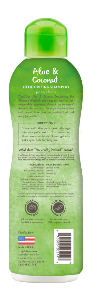 TropiClean Aloe & Coconut Deodorizing Dog & Cat Shampoo effectively eliminates pet odors at their source while replenishing the moisture balance of your pet’s skin and coat. The tropical scent of aloe and coconut leaves them smelling fresh and ready for cuddles! TropiClean Pet Products are cruelty free.