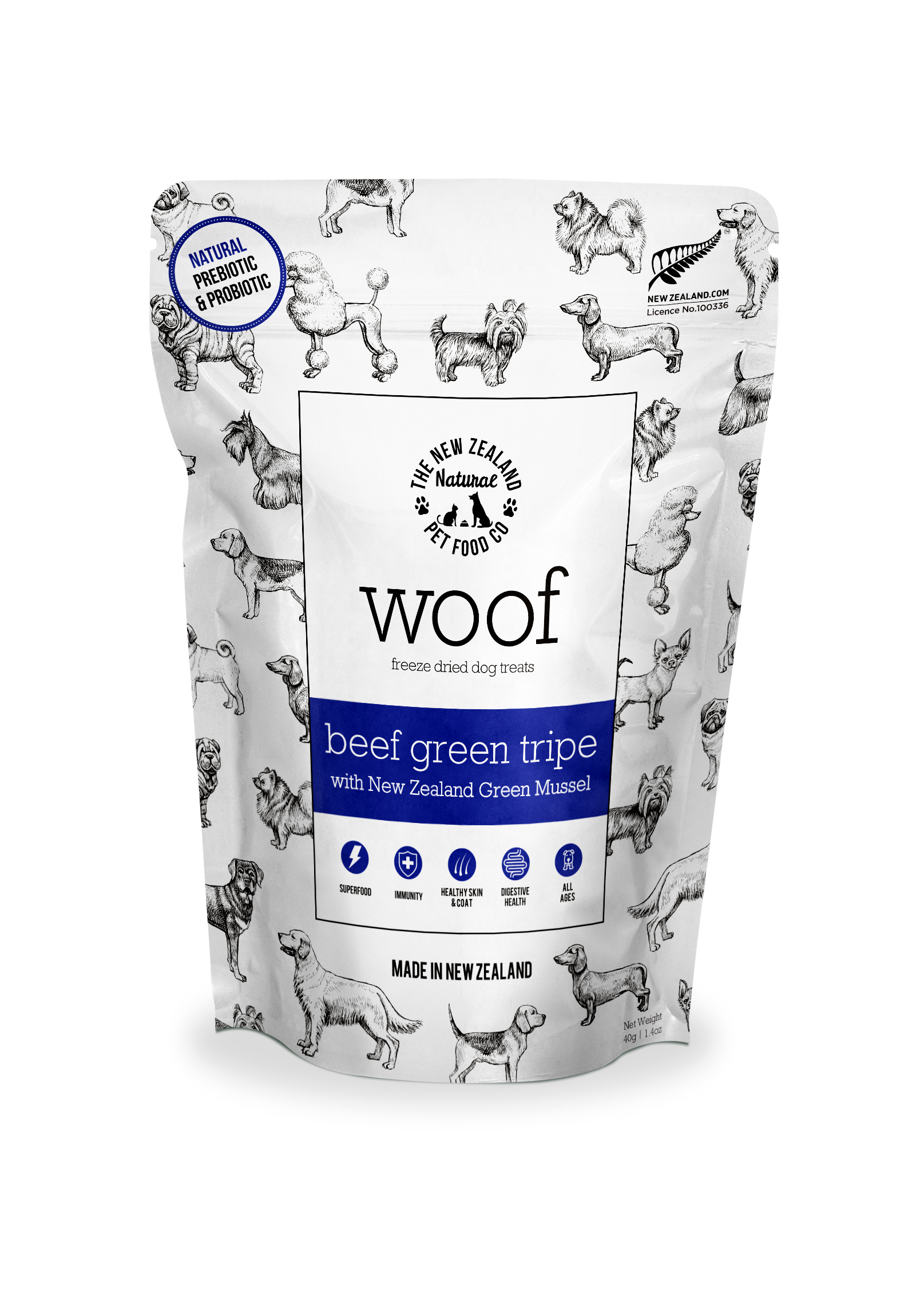 WOOF Beef Green Tripe w/ NZ Green Mussel Treats are made using only the highest quality ingredients aimed at nourishing your pet's health. We combine the nutrition and taste of fresh, raw food and put it through a gentle freeze drying process which protects all the natural enzymes and nutrients, so none of the wholesome goodness is cooked out.