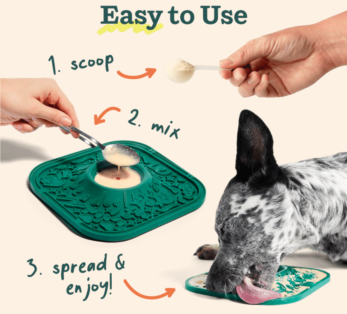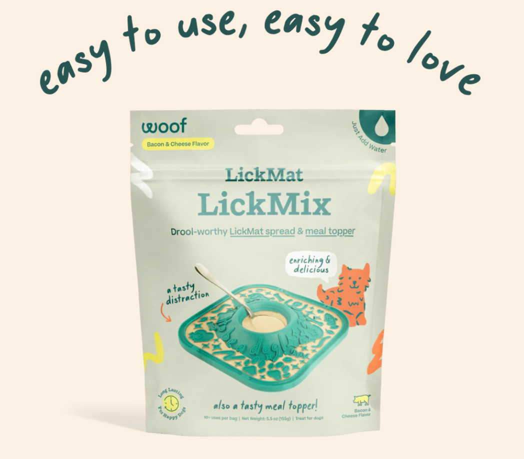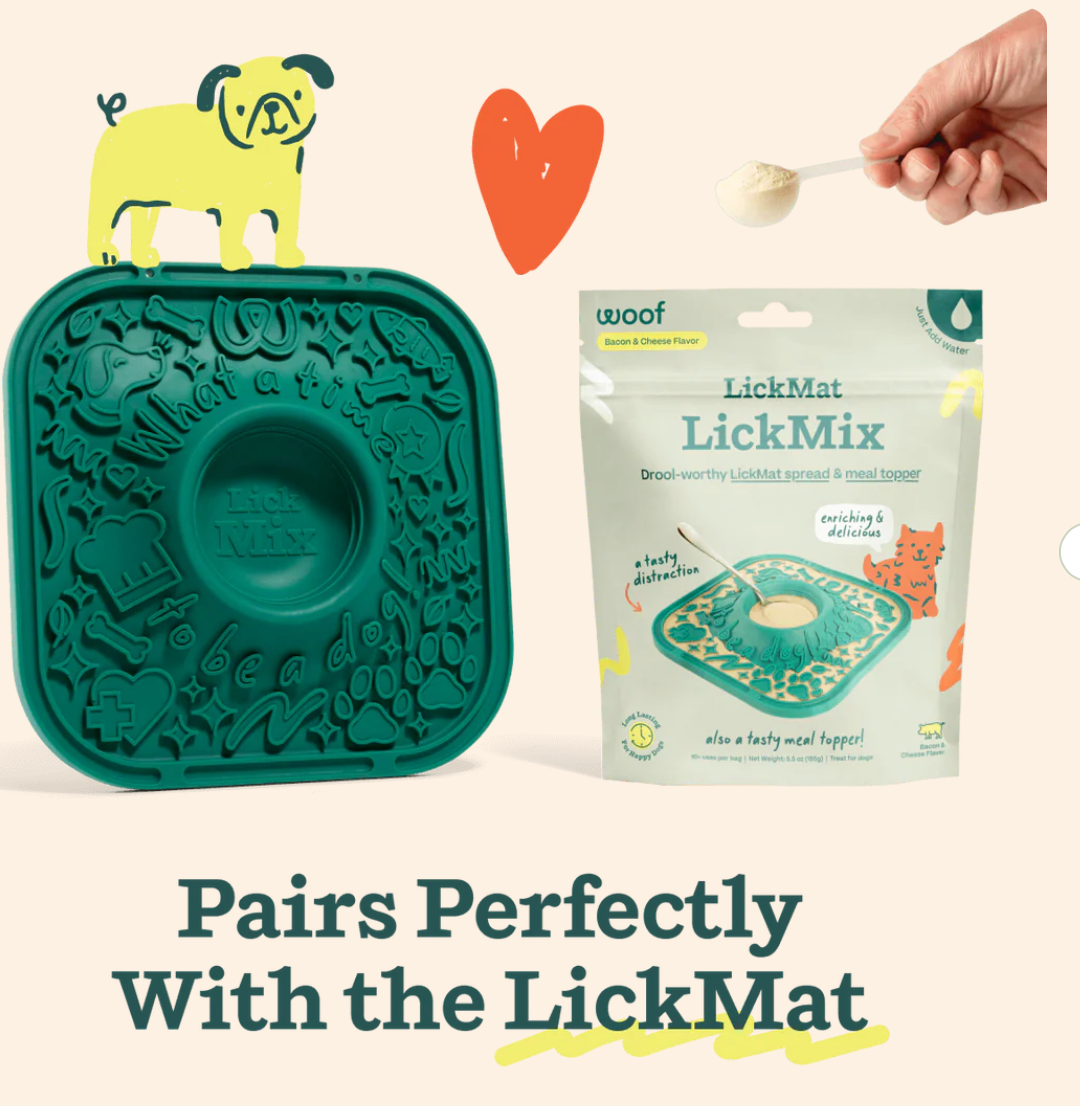 Just scoop, mix, and spread for a delicious distraction! LickMix lets your dog lick away their stress, which is shown to promote calm in anxious pups. Just scoop it out and add water to create a jello-like consistency that’s easy to spread and ready to serve in seconds—no freezer required! Plus, it’s way easier to clean than traditional lick mat spreads like peanut butter or yogurt. Pair with the Woof LickMat to calm your pup during bathtime, dinnertime, or any other occasion that calls for a delicious distraction.
