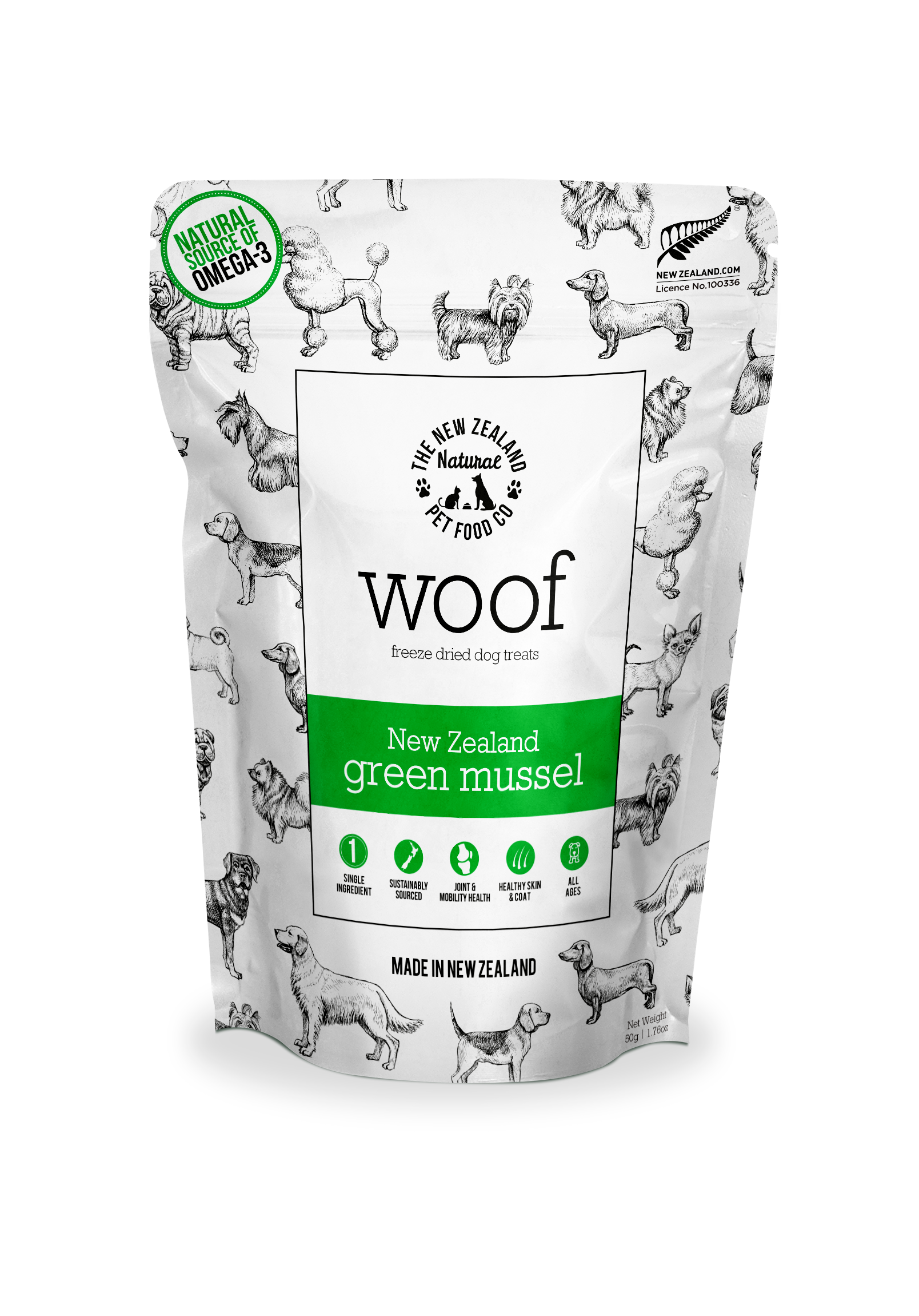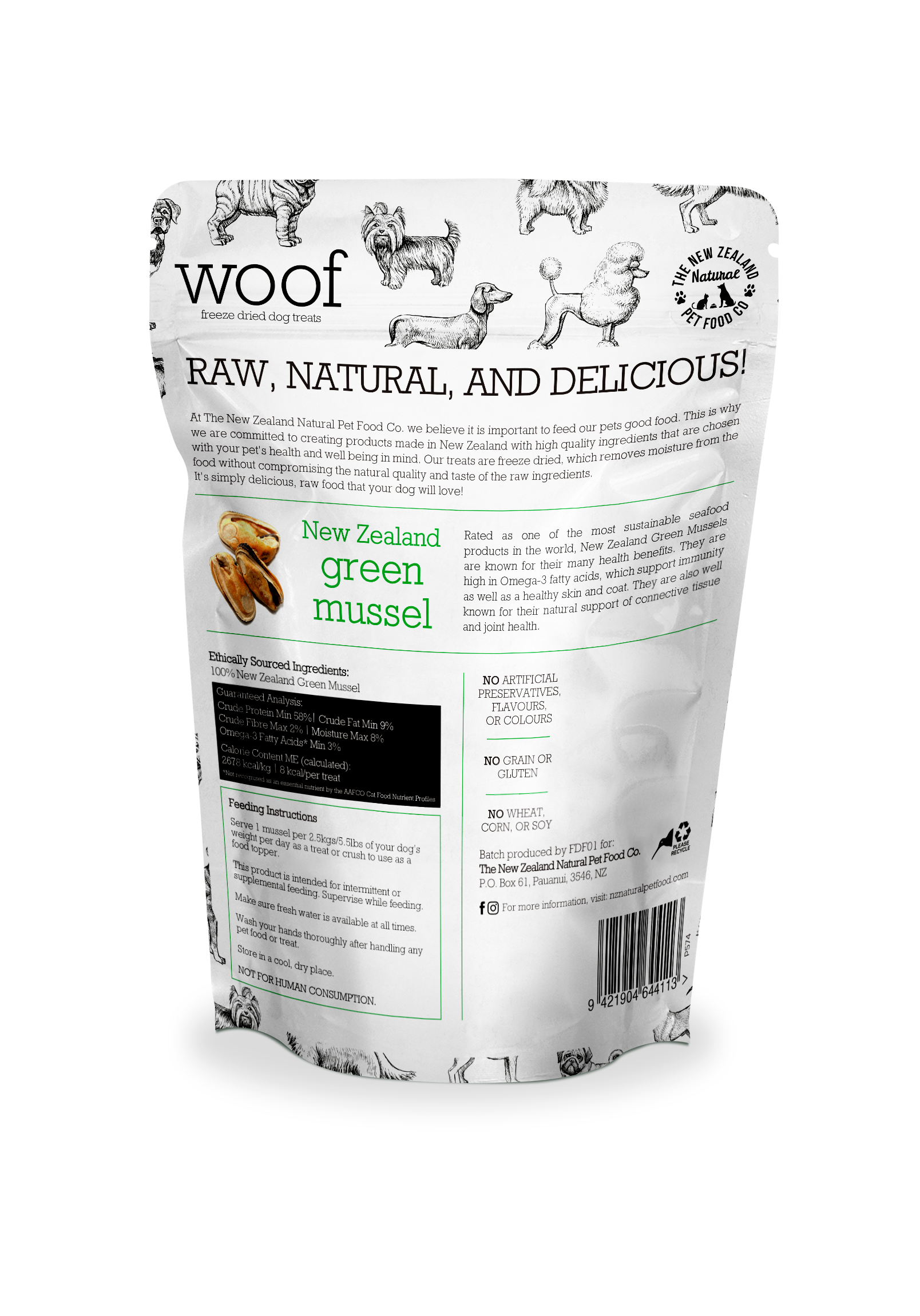 WOOF NZ Green Mussel Treats are a healthy, protein-rich snack for your dog. New Zealand Green Lipped Mussels are renowned for their health benefits; they are high in omega-3 fatty acids, and a great source of glucosamine which supports joint health. These WOOF treats have been gently freeze-dried to protect all the natural enzymes and nutrients, so none of the wholesome goodness is cooked out. Raw, Natural, and Delicious!