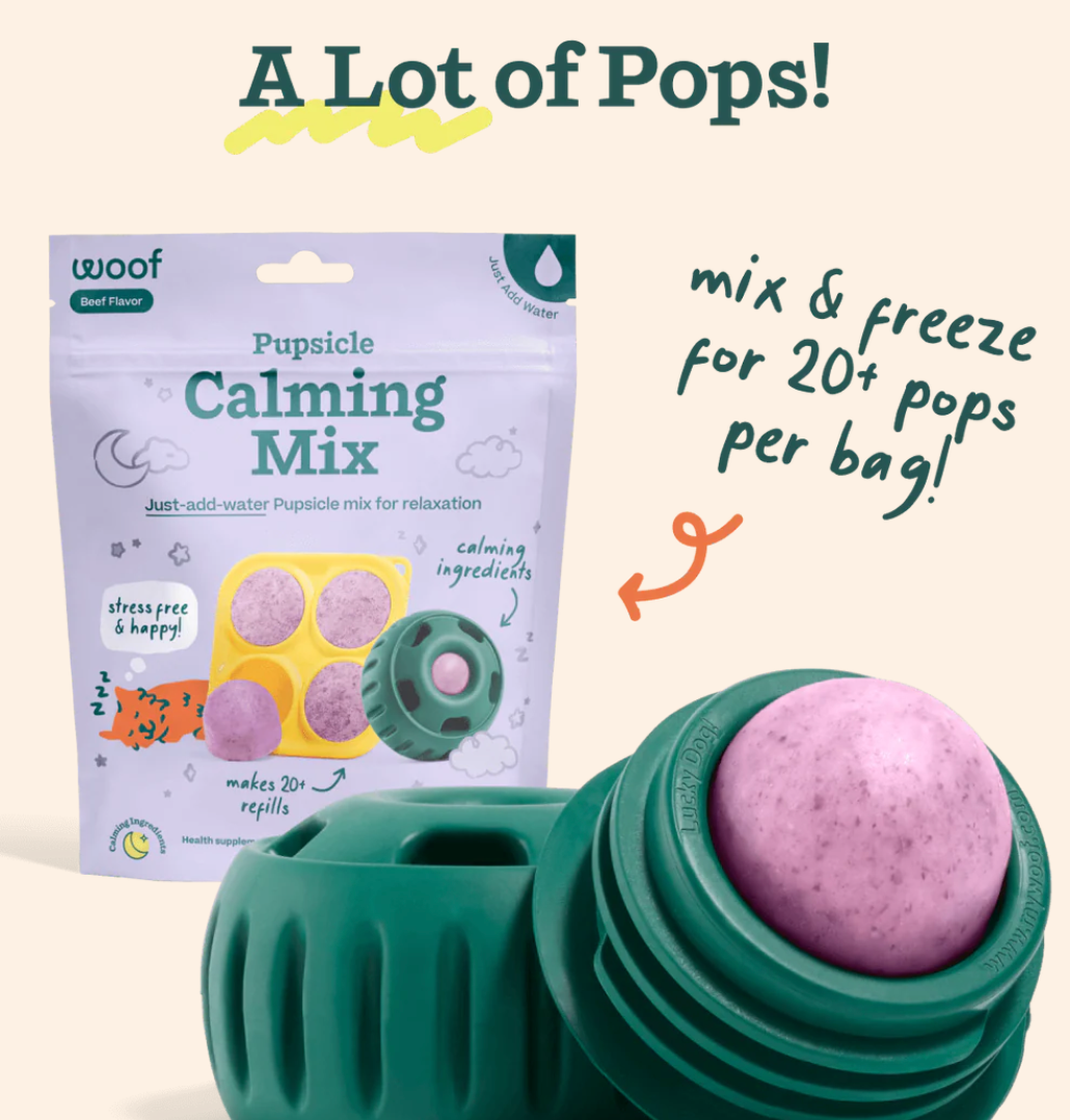 Dogs get stressed out, too! Whether it’s a delivery, thunderstorms, or car rides, they could use a little extra support. Calming Pupsicle Mix, crafted to support stress relief and relaxation, features ingredients including L-Tryptophan, L-Theanine, and GABA to promote mood balance, calmness, and better sleep. Chamomile adds natural soothing properties, while blueberry and purple sweet potato add antioxidant power. With a comforting aroma inspired by peaceful evenings, just mix it up to give your pup a relaxing pop. Each bag makes 20+ refills so you can offer your pup delicious pops on repeat.