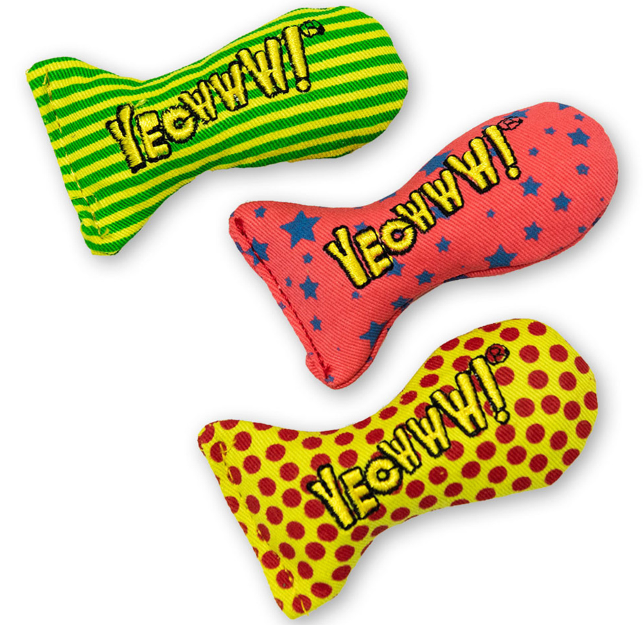 Wonderfully odorous! Each of the 3 colorfully embroidered eye-catching fishies is a keeper, and naturally filled to the gills with YEOWWW! catnip.